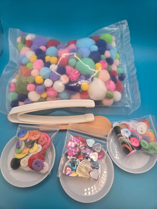 In this kit you will place the pompom base and mix in hearts and button. Kids recurrence 3 small plates with tweezers to sort the items. They can sort by colors, sizes, or item.